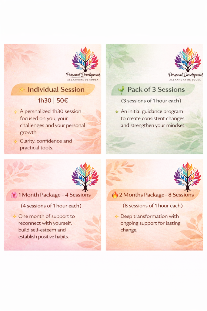 Uma sessão personalizada de desenvolvimento pessoal, pensada para trabalhar os teus desafios atuais, promover clareza mental e fortalecer a tua confiança.